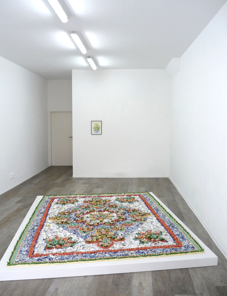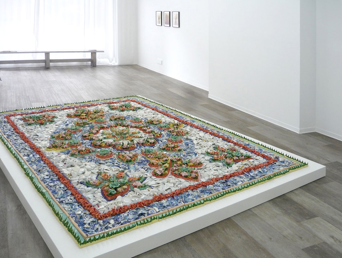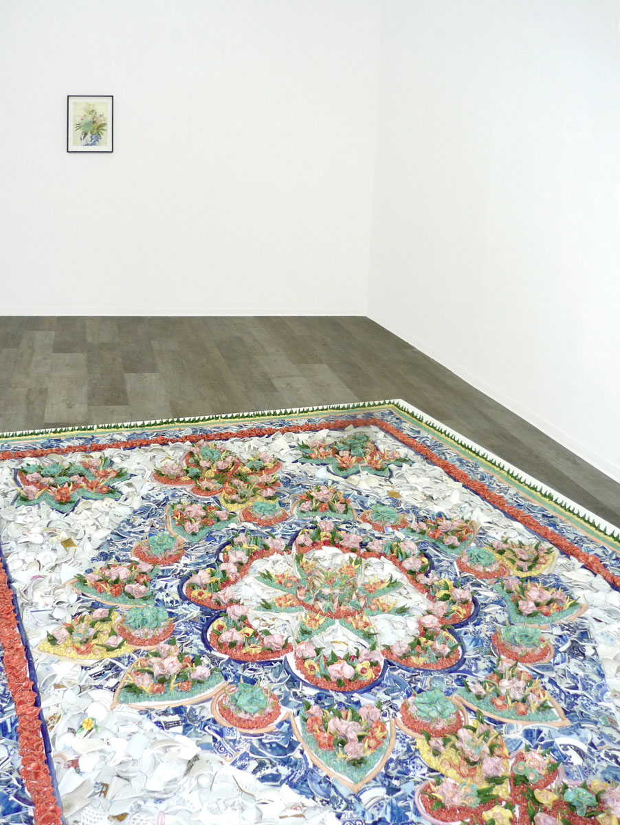 Beate Höings monumentale Bodenarbeit ‚playing by heart’ ist inspiriert von Ornamentik und Stofflichkeit der sogenannten ‚Orientteppiche’, bedient sich dabei allerdings erstaunlicher Materialen, nämlich zerschlagenem Porzellan und glasierten Keramikelementen.