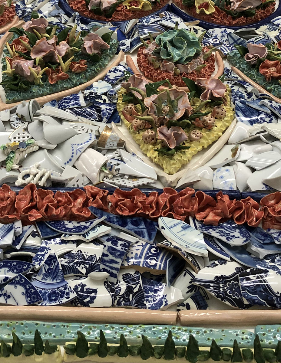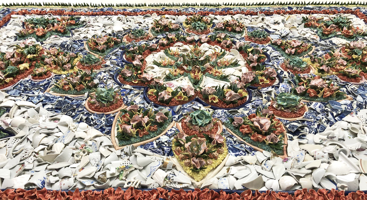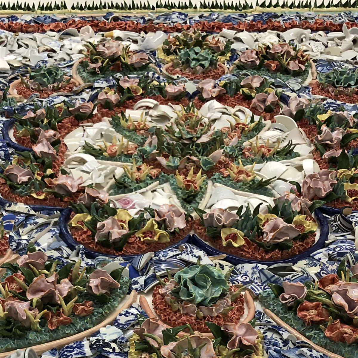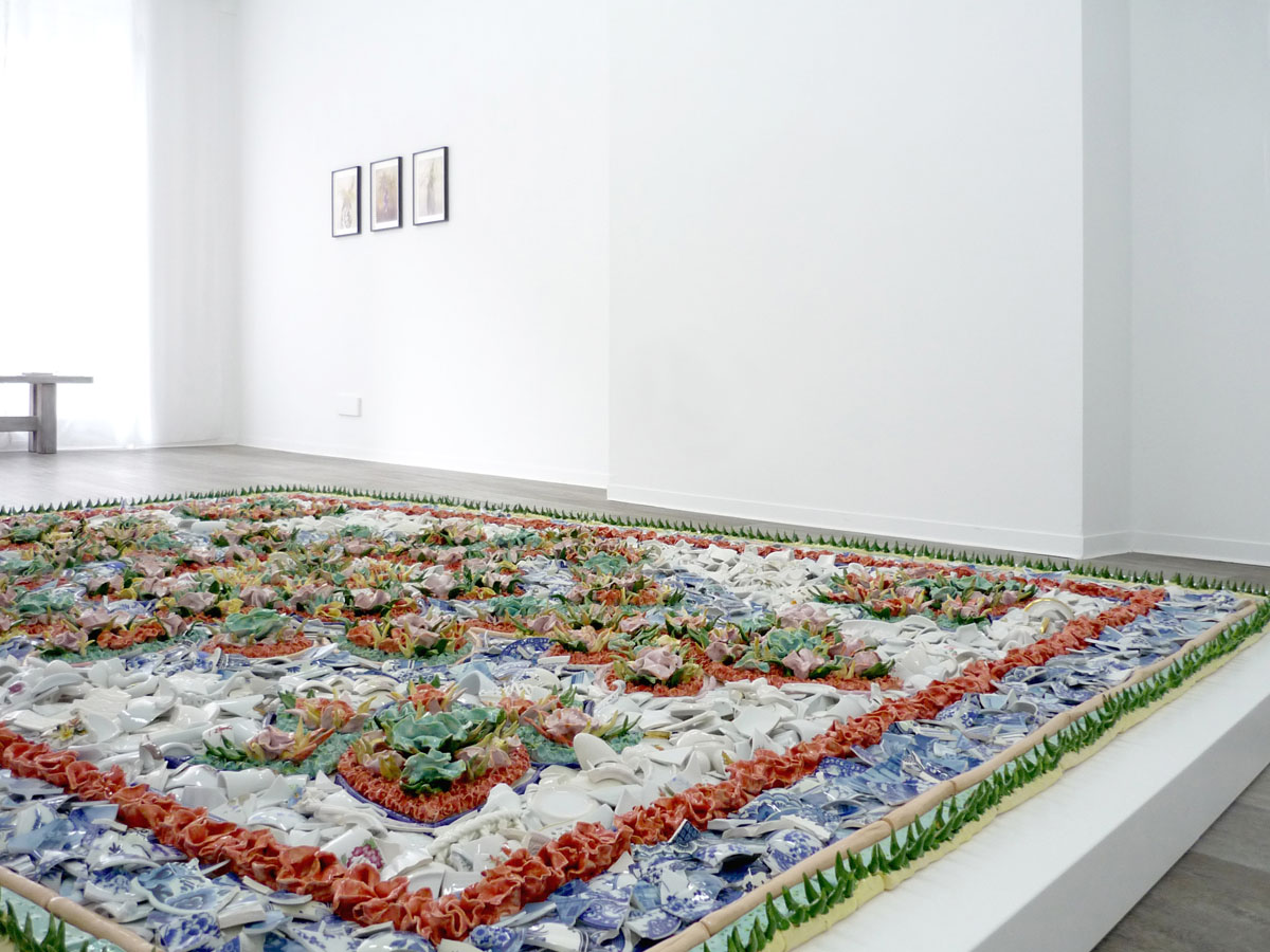 Beate Höings monumentale Bodenarbeit ‚playing by heart’ ist inspiriert von Ornamentik und Stofflichkeit der sogenannten ‚Orientteppiche’, bedient sich dabei allerdings erstaunlicher Materialen, nämlich zerschlagenem Porzellan und glasierten Keramikelementen.
